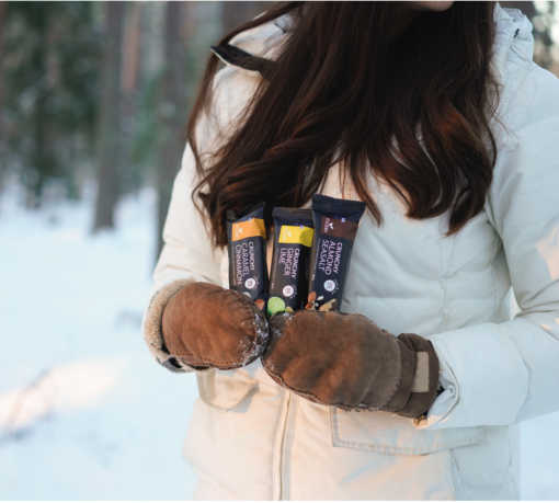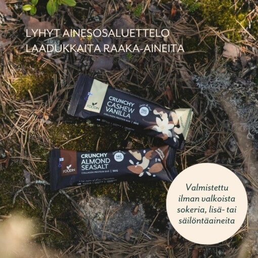 Our unique Collagen Protein Bars are a one-of-a-kind alternative to traditional protein bars. These protein bars are created without additives or preservatives, from nature’s own ingredients, such as nuts and seeds. Each bar contains 12-14 grams of protein, of which 6,5 – 7,7 grams is high-quality, hydrolyzed Grass-fed collagen protein. The Cashew-Vanilla Collagen Protein Bar is a perfect fit for gym workouts and hiking trails, and functions well as a working day snack or during an intense studying session. The bar is so delicious that it also works as a dessert! Try slicing and dipping the bar into raw chocolate or other paste, or make a snack mix from various different flavours!