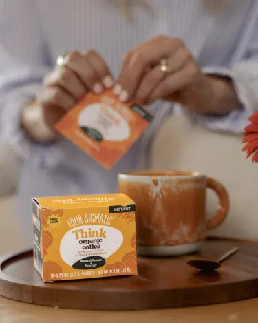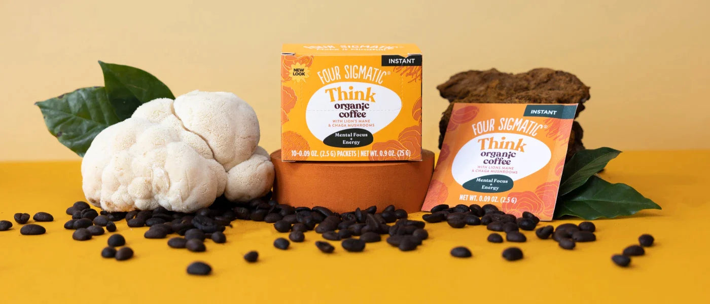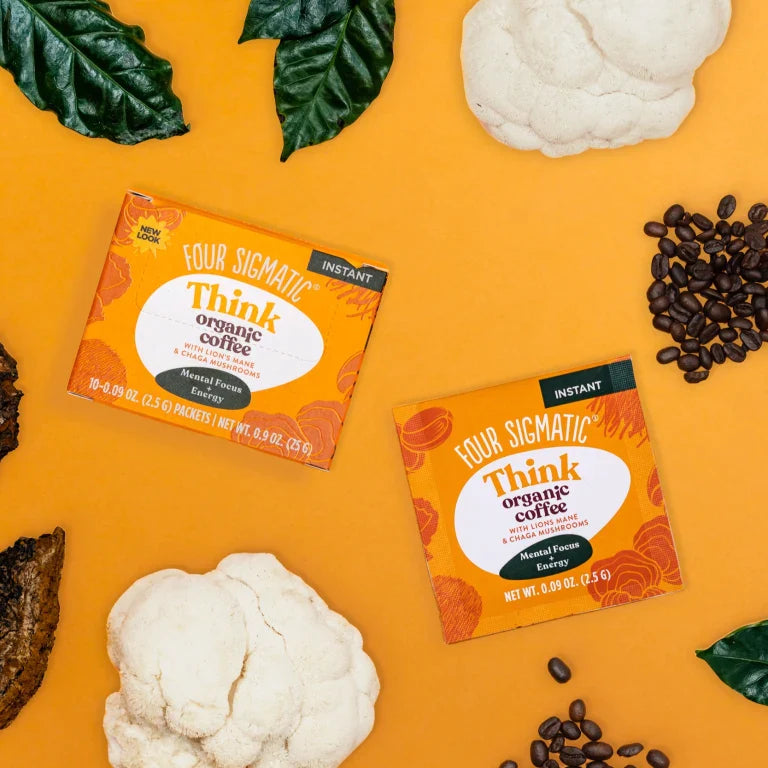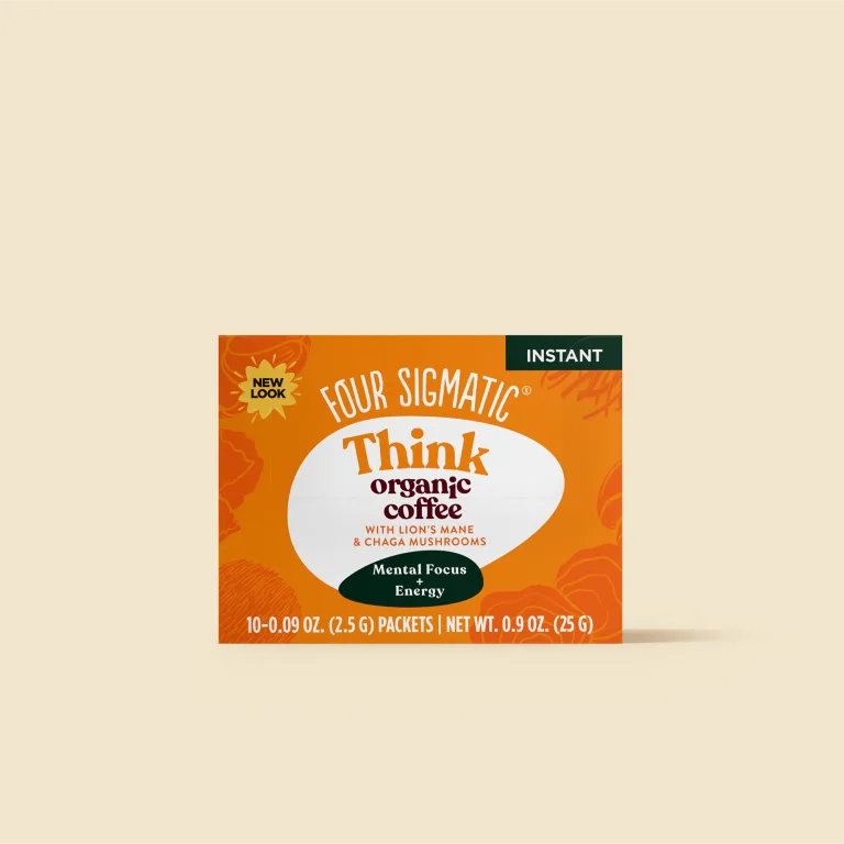 Organic instant coffee infused with lion’s mane and chaga mushrooms for focus in a convenient instant packet.